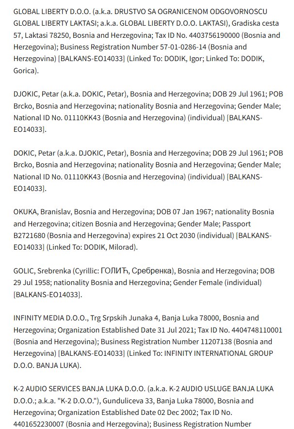 Takođe, ranije ovaj mjesec ukinute su sankcije za četiri osobe iz Republike Srpske. Ministarstvo finansija SAD-a je izbrisalo sa liste sankcionisanih Danijela Dragičevića, Јelenu Pajić Baštinac, Gorana Rakovića i Dijanu Milanković, objavljeno je na zvaničnoj stranici Ministarstva.