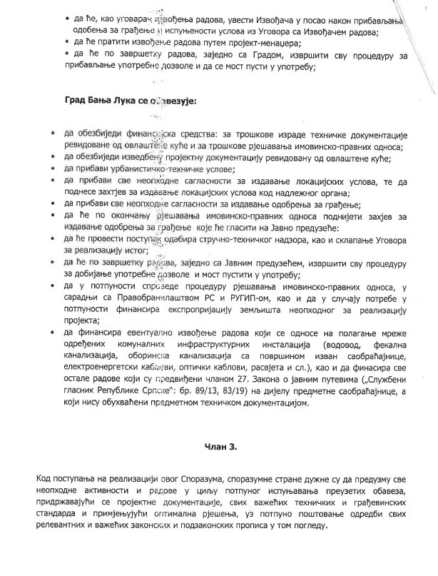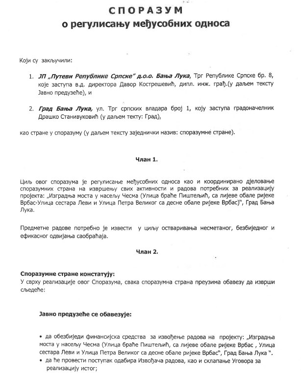 - Upravo iz pomenutih razloga su Putevi i raspisali nabavku za most, te ga izgradili. Danas je počelo i postavljanje ograde na mostu i uskoro će svi radovi biti završeni. Da su Putevi Republike Srpske imali obavezu da urade pristupne puteve to bi bilo i urađeno, a ne bi Grad Banjaluka raspisao javnu nabavku za izgradnju pristupnih puteva što je i vidiljivo iz dokumentacije - navode iz ovog preduzeća, reagujući na navode gradonačelnika Banjaluke o nadležnostima za izgradnju pristupnih puteva.