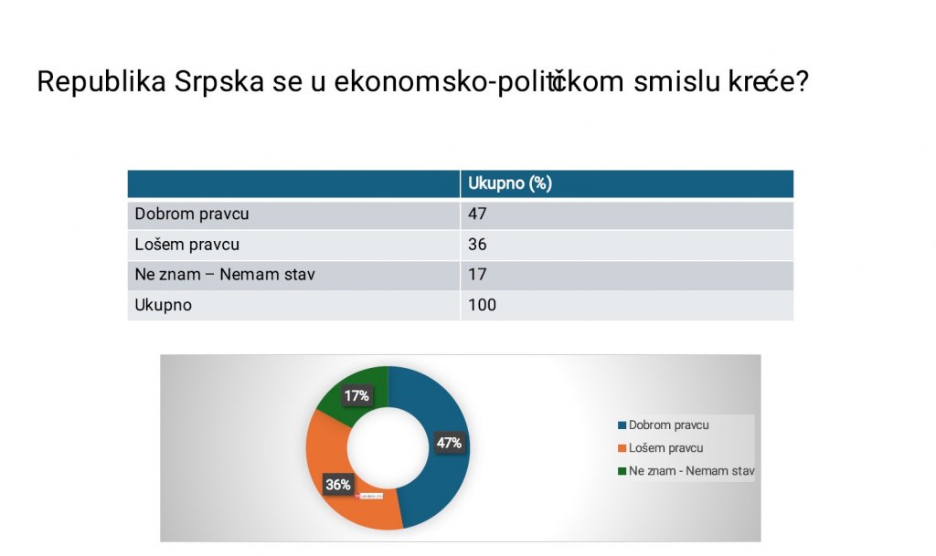 Prema rezultatima ankete, koje je tokom marta ove godine na uzorku od 1.200 ispitanika sprovela agencija "Faktor plus", 47 odsto građana smatra da se Republika Srpska u ekonomsko-političkom smislu kreće u dobrom pravcu, dok 36 odsto ocjenjuje da je pravac loš.