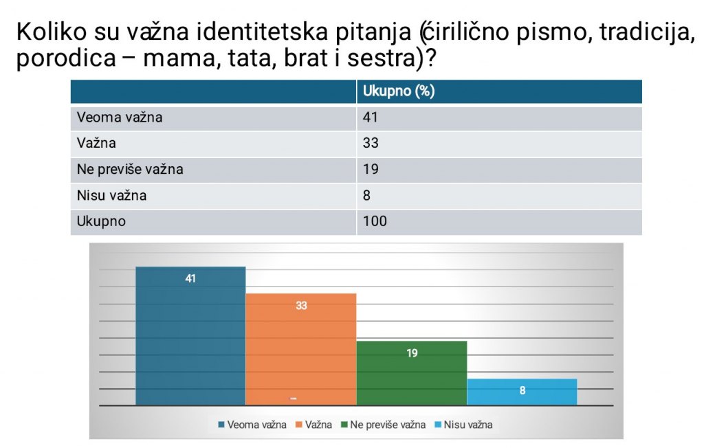 Koliko su važna identitetska pitanja (ćirilično pismo, tradicija, porodica – mama, tata, brat i sestra) ispitanici ćirilično pismo smatraju veoma važnim - njih 36 odsto, a dodatnih 32 odsto kaže da je važno.