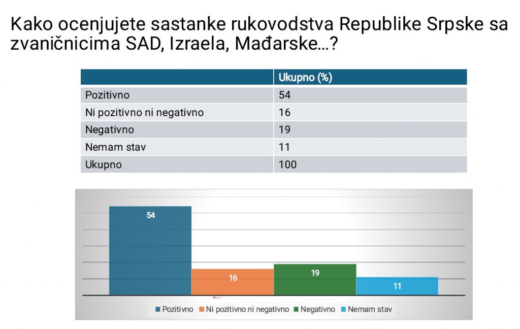 54 odsto ispitanika smatra veoma važnim sastanke rukovodstva Republike Srpske sa zvaničnicima SAD, Izraela, Mađarske, dok 19 odsto ima negativan stav. Neutralnih je 16 odsto, a bez mišljenja 11 odsto.