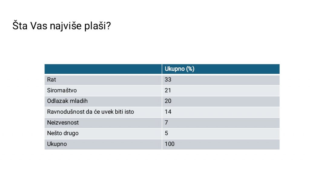 Najveći broj građana, njih 33 odsto, kao najveću prijetnju vidi rat. Slijede siromaštvo - 21 odsto i odlazak mladih -20 odsto.