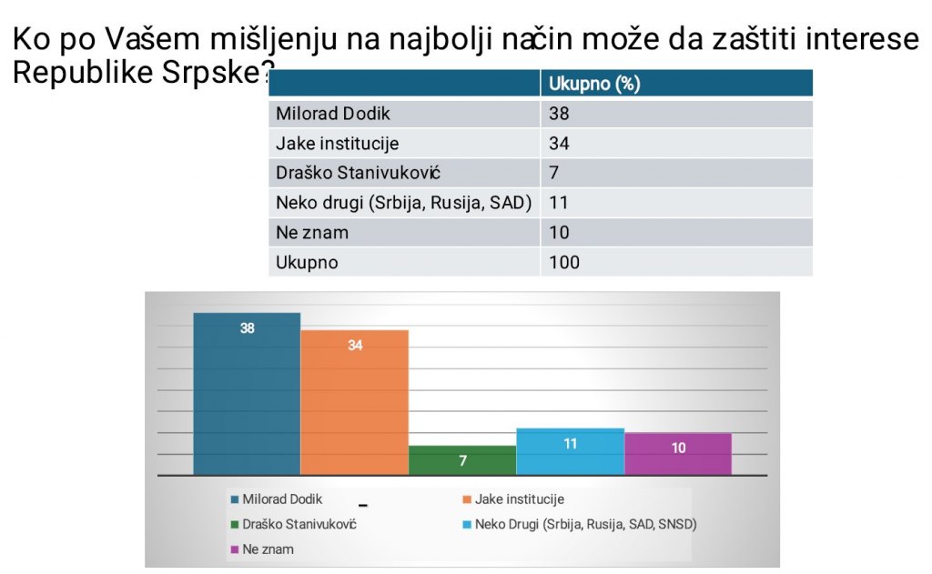 Kada je riječ o tome ko može najbolje da zaštiti interese Republike Srpske, najviše povjerenja građani daju Miloradu Dodiku - 38 odsto.