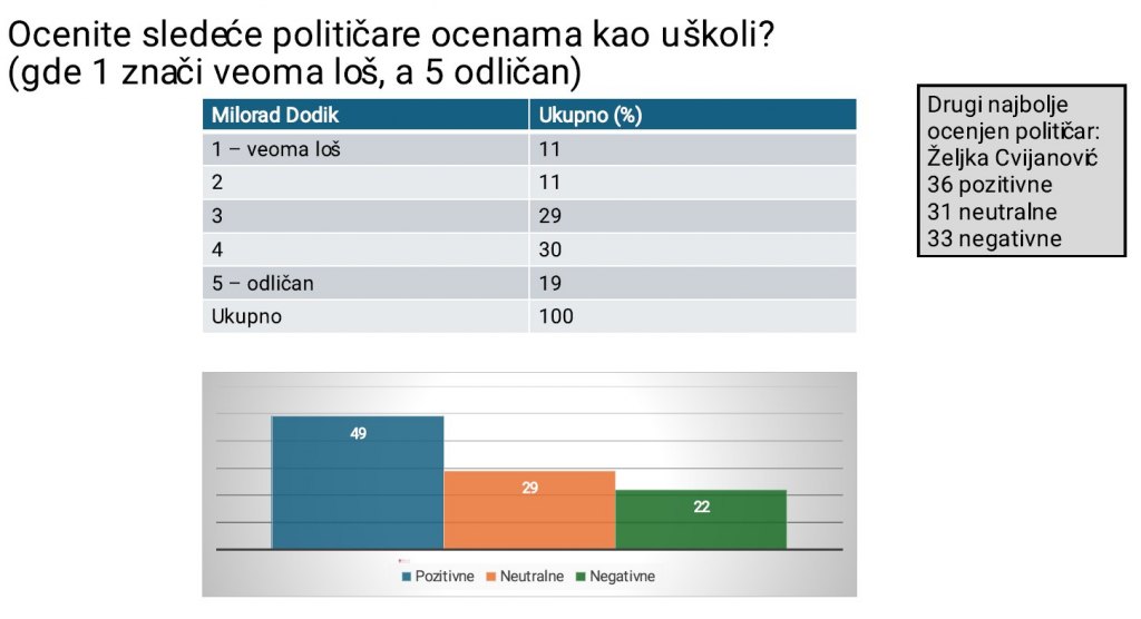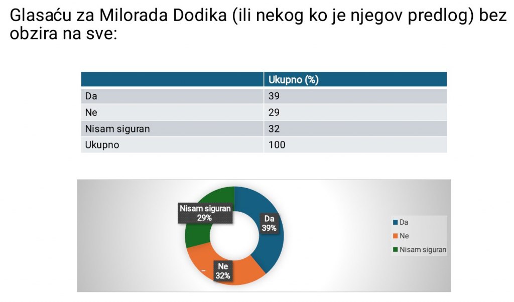 39 odsto ispitanika glasalo bi za Milorada Dodika ili kandidata kojeg on podrži "bez obzira na sve", dok je 29 odsto protiv, a čak 32 odsto neodlučno.