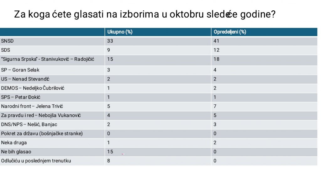 Za koga ćete glasati na izborima u oktobru sljedeće godine, najveći broj glasova dobila je stranka SNSD.